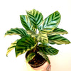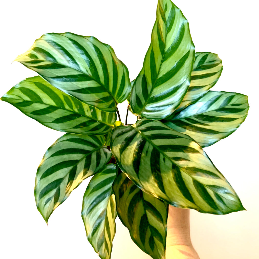 Calathea prefer indirect light and watering when the soil begins to feel dry, with a very brief “dry-out” period between watering. Plant in a well-draining potting soil with adequate drainage. As forest floor jungle plants, Calathea grow best in higher humidity, so place near other plants, a humidifier, or in a well-lit bathroom or kitchen with higher moisture in the air.