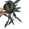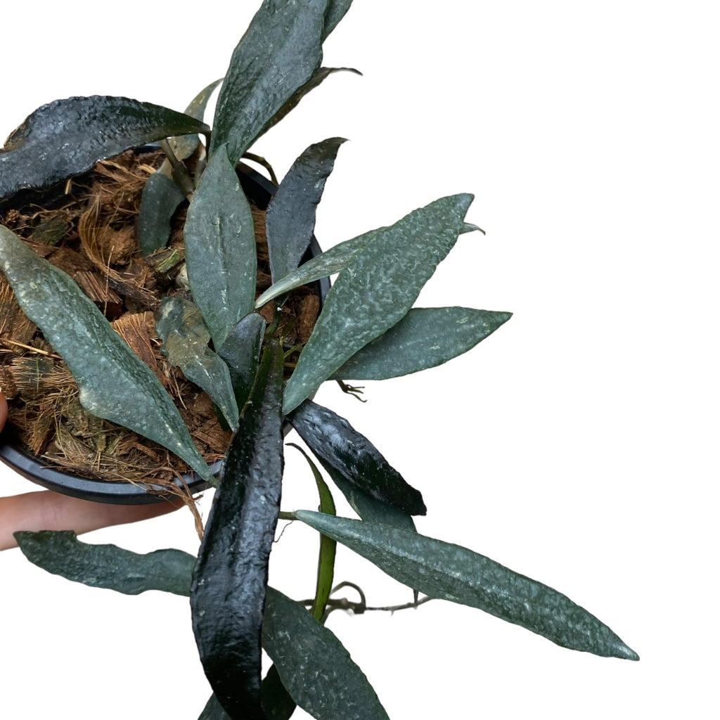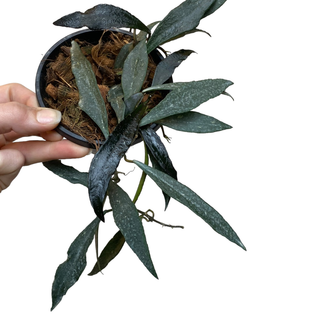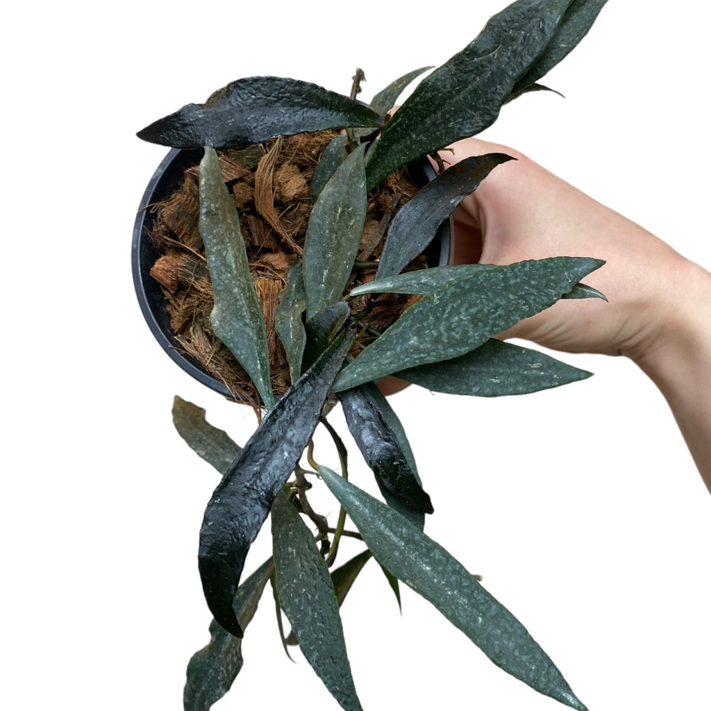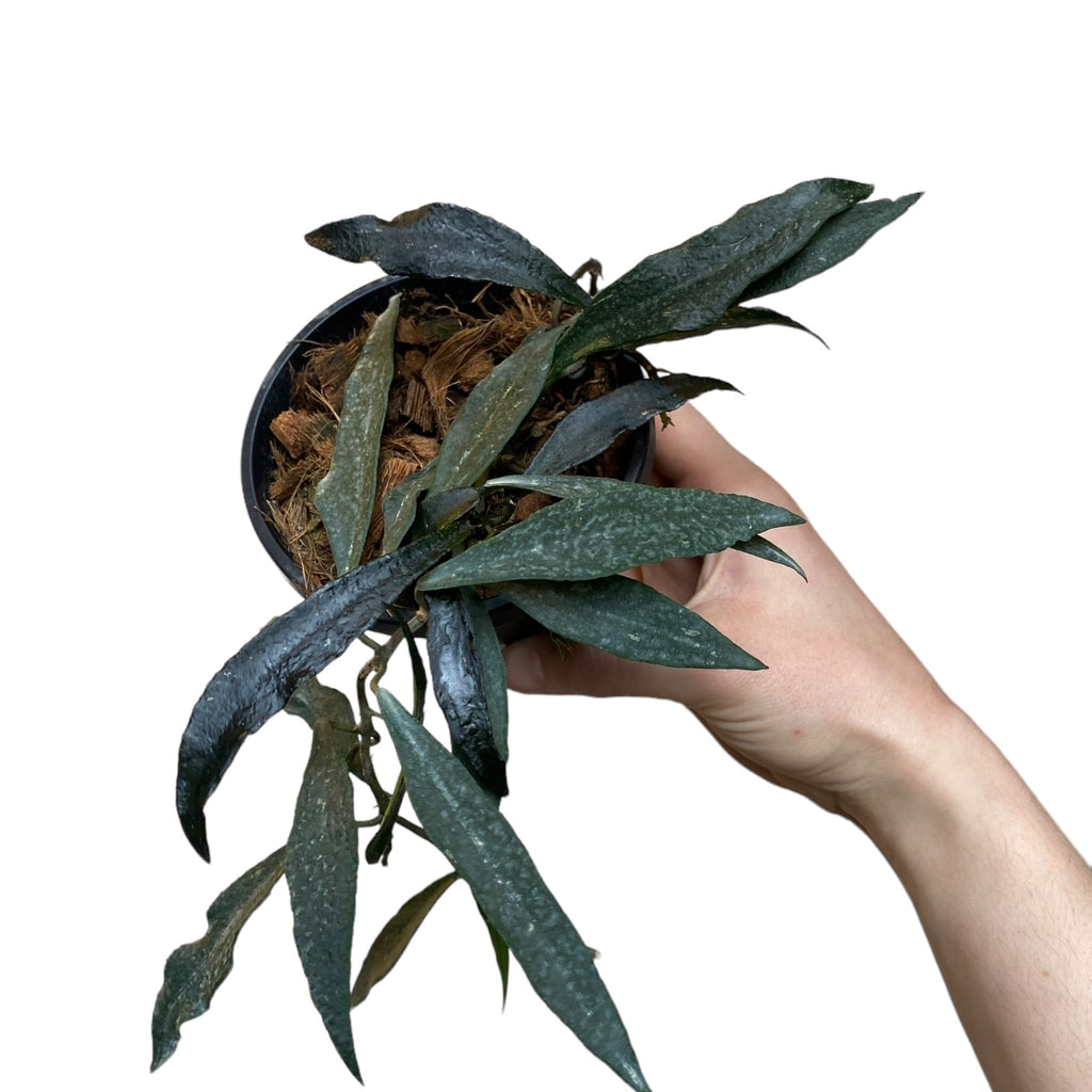 Hoya mirabillis has narrow, deep green to nearly purple hued leaves with light silver flecking. Very interesting and less common. Would grow best with vertical support or as a cascading specimen.