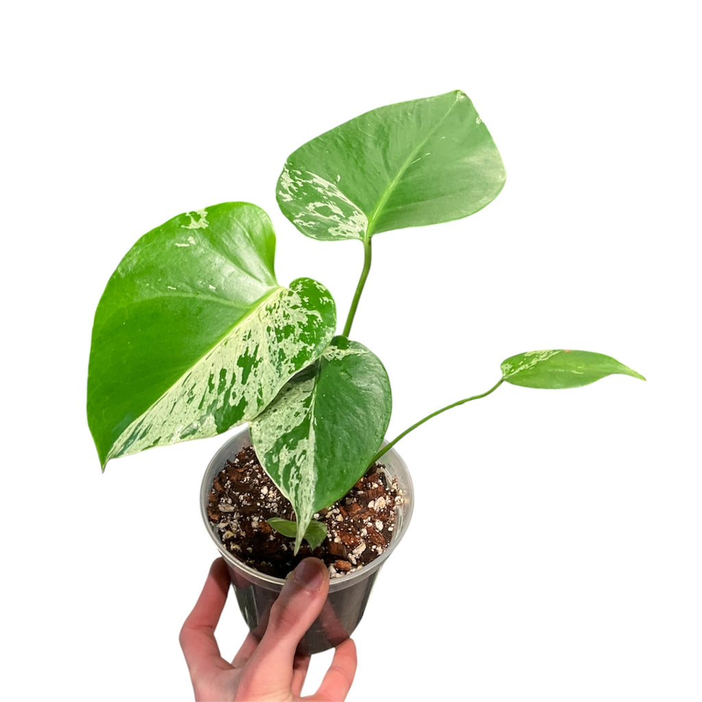 Monstera prefer bright, indirect light. Pot in a loose, well-draining aroid potting blend and water when the soil feels dry. Provide a pole or support to encourage larger leaves and stronger vine growth.
