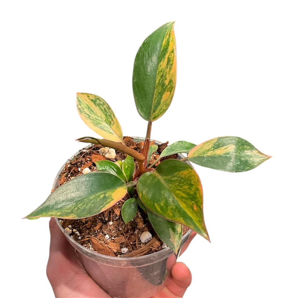 For best color and performance, grow in a bright, indirect light and allow soil to dry between watering. Provide support as it matures and plant in a well-draining, aroid potting substrate.