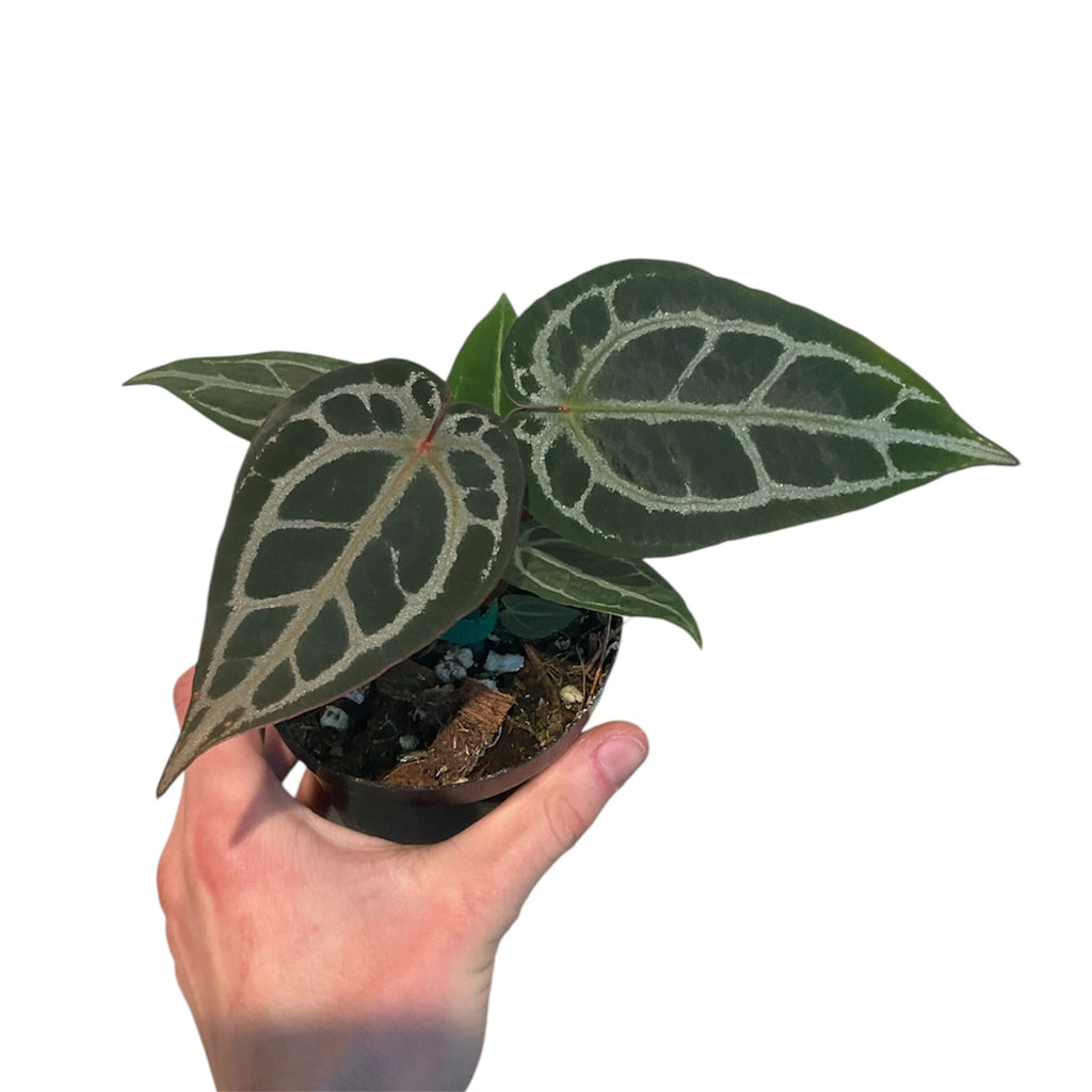 This Anthurium is a hybrid cross between 'Zara’ x ‘Brielle’ and is a rare, collector specimen that has vivid, velvety leaves with highly contrasted veins. These anthurium seem to be “hardier” than most, not having issues with lower humidity.