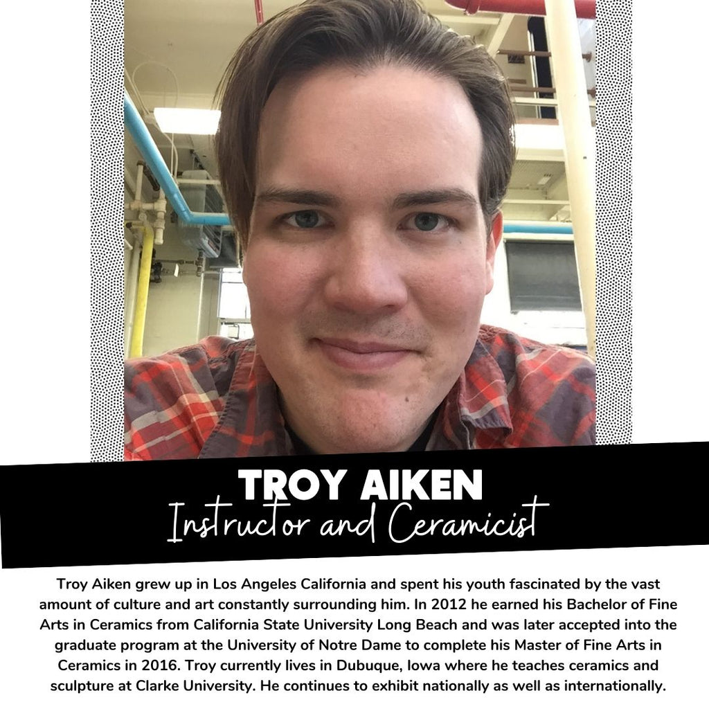Troy Aiken grew up in Los Angeles California and spent his youth fascinated by the vast amount of culture and art constantly surrounding him. Early on he decided to work with ceramics as a medium and was drawn to the malleability of clay and the broad range of personal expression that could be achieved with the material. In 2012 he earned his Bachelor of Fine Arts in Ceramics from California State University Long Beach and was later accepted into the graduate program at the University of Notre Dame to complete his Master of Fine Arts in Ceramics in 2016. Troy currently lives in Dubuque, Iowa where he teaches ceramics and sculpture at Clarke University. He continues to exhibit nationally as well as internationally.