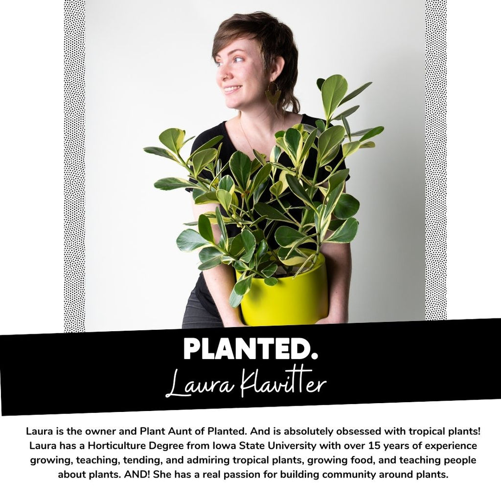 Laura is the owner and Plant Aunt of Planted. And is absolutely obsessed with tropical plants! Laura has a Horticulture Degree from Iowa State University with over 15 years of experience growing, teaching, tending, and admiring tropical plants, growing food, and teaching people about plants. AND! She has a real passion for building community around plants.