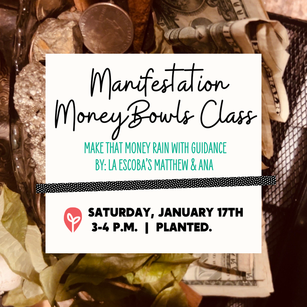 La Escoba will be providing a curated selection of vintage vessels to fill with incense, herbs, money rice (which is spelled and blessed ahead of time), crystals, chime candles along with a mini spell candle to do your first spell at the workshop. Choose from herbs that correspond with the manifestation money bowls and pick what resonates most. In the workshop we will be discussing basics on candle magic, sigil work, and how to manifest and draw in that energy of prosperity abundance and success.