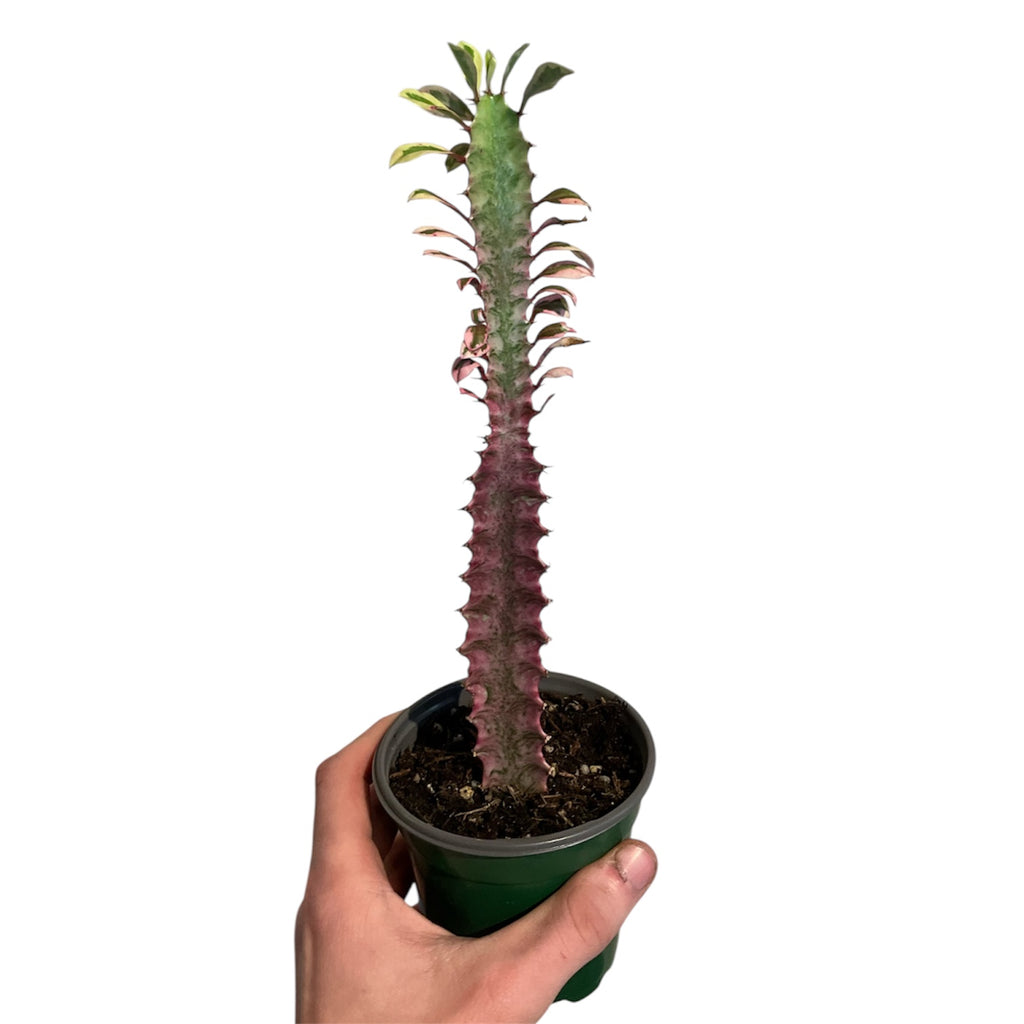 Euphorbia ‘Royal Red’ has a deep burgundy color that gives it a bold, elegant look that stands out in any space. Its branches grow in a vertical, triangular pattern, edged with short thorns and small leaves.