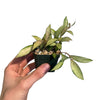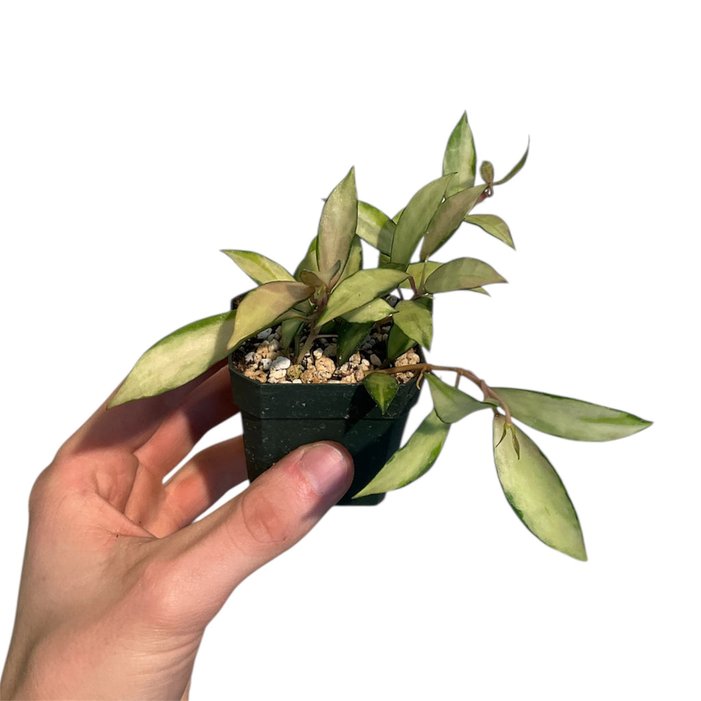 Hoya lacunosa ‘Souma’ is a more petite growing hoya with variegation patterns ranging in white, pink, creams, and yellows on pointed leaves.